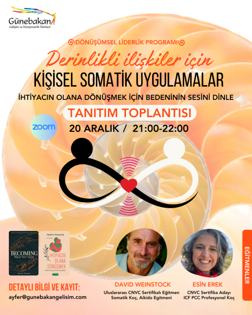 Nisan ayında David Weinstock ve Esin Erek kolaylaştırıcılığında İstanbul Seshane’de gerçekleştireceğimiz 5 günlük Somatik Şiddetsiz İletişim inzivası ile ilgili sorularınıza yanıt verebilmek için buluşuyoruz.